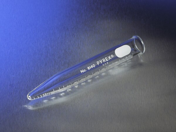 These 12 mL heavy duty PYREX conical centrifuge tubes have durable white enamel graduations and are made to the same O.D. and length specifications as No. 8060, but with increased wall thickness for greater mechanical strength. In order to conform to outside diameter and overall length limitations imposed by centrifuge rotors and supports, it has been necessary to reduce the capacity these heavy duty tubes. The 12 mL size is graduated upward from tip in 0.1 mL divisions.