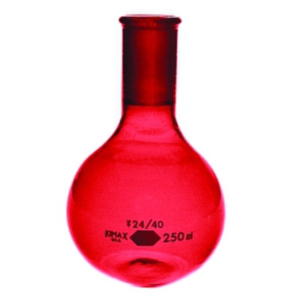 RAY-SORB® FLAT BOTTOM BOILING FLASKS · KIMAX® boiling flask is RAY-SORB® processed to provide protection to solutions sensitive to light of the shorter wavelengths · Less than 1% transmission below 400 nm and approximately 5% transmission from 400-600 nm · Short neck · Flat bottom · Full length 24/40 joint · Designed from ASTM Specification E1403, Type I, Class IV requirements · Manufactured from 33 expansion, low extractable borosilicate glass conforming to USP Type I and ASTM E438, Type I, Class A requirements and then RAY-SORB® processed