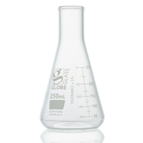 Flask, Erlenmeyer, Globe Glass, 250mL, Heavy Duty, Narrow Mouth, Dual Graduations, ASTM E1406, 6/