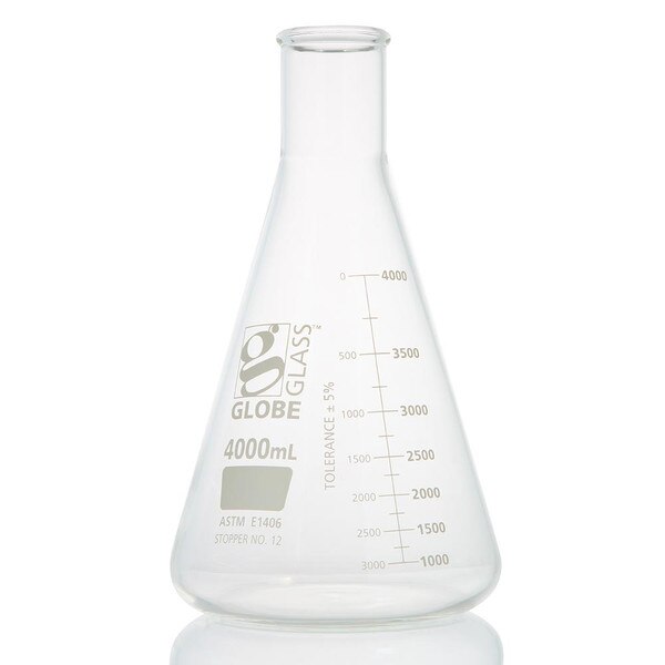 Flask, Erlenmeyer, Globe Glass, 4000mL, Heavy Duty, Narrow Mouth, Dual Graduations, ASTM E1406, 1